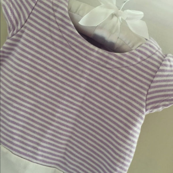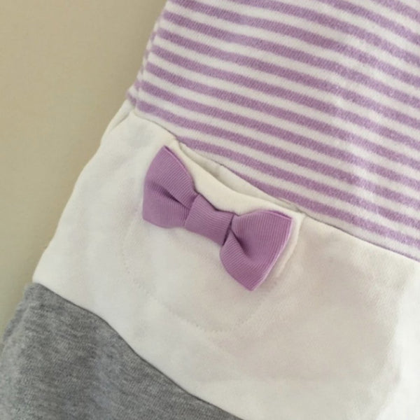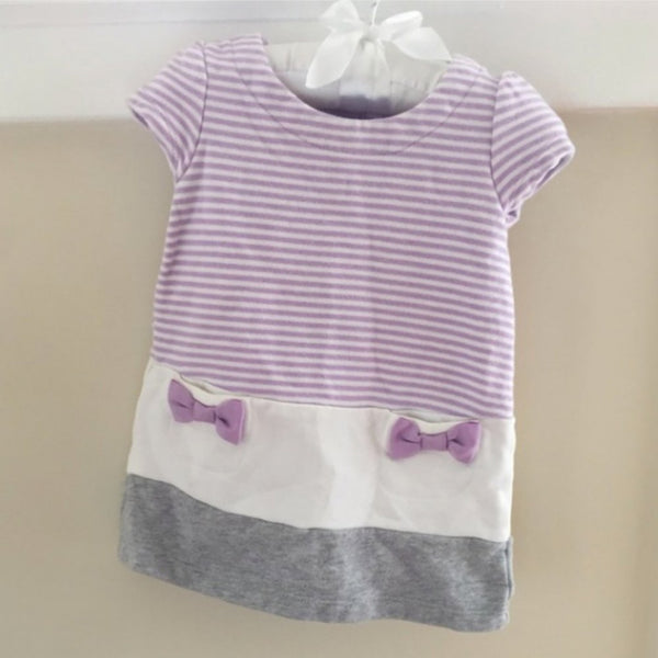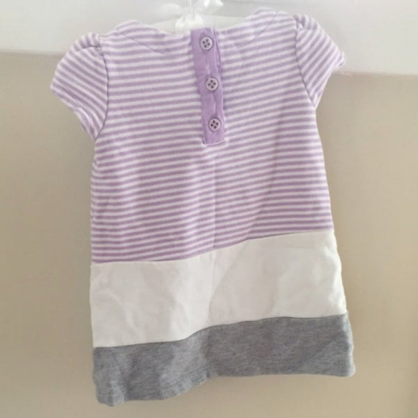 Gymboree Purple Striped Pocket Dress. Baby girl size 6-12 months. Super soft and suitable for every day play, but works well for a party, too! Light purple and white stripes on top and think white and grey stripes on the bottom. Has two hidden pockets with adorable purple bows. Buttons in the back allow for easy dressing. Pair with leggings as baby grows and wear as a long top!
