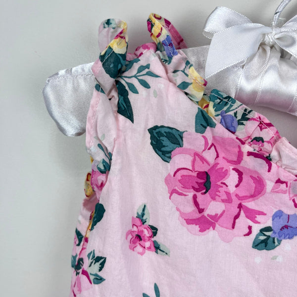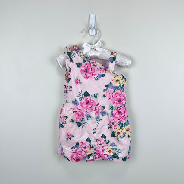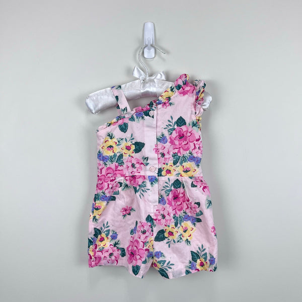 Janie and Jack Pink Floral Romper. Baby girl size 6-12 months. Gorgeous garden-inspired flower print. Asymmetrical one shoulder style. Ruffle trim. Buttons in the back. 100% cotton batiste. Partially lined. Has front pockets. Retail $54. Perfect for a party!