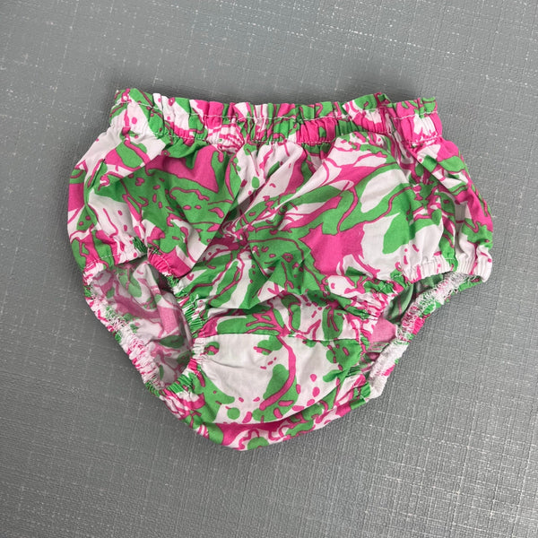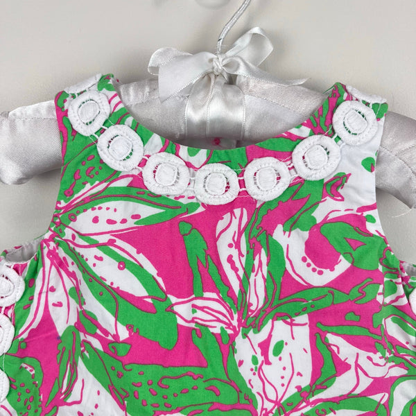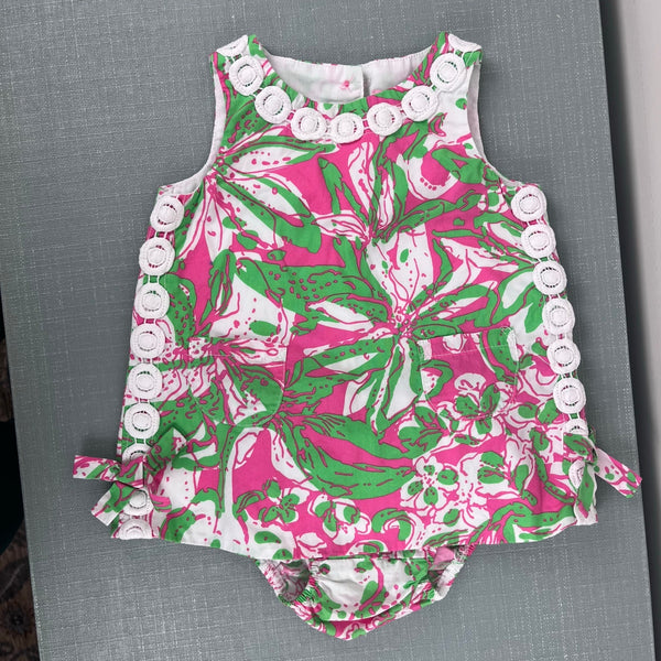 Lilly Pulitzer Baby Lilly Infant Shift Dress Pink Green Flowers. Baby girl size 6-12 months. Classic, preppy style. Sleeveless dress with bold pink, green, and white flower print. Lace detail along the neck and sides. Fixed bows at the hem. Button back. Fully lined. Includes matching diaper cover. No flaws noted!