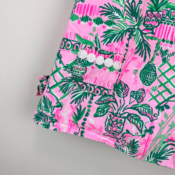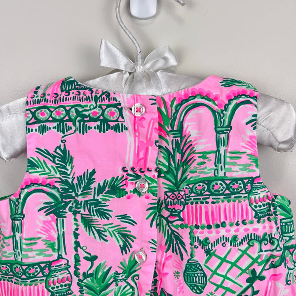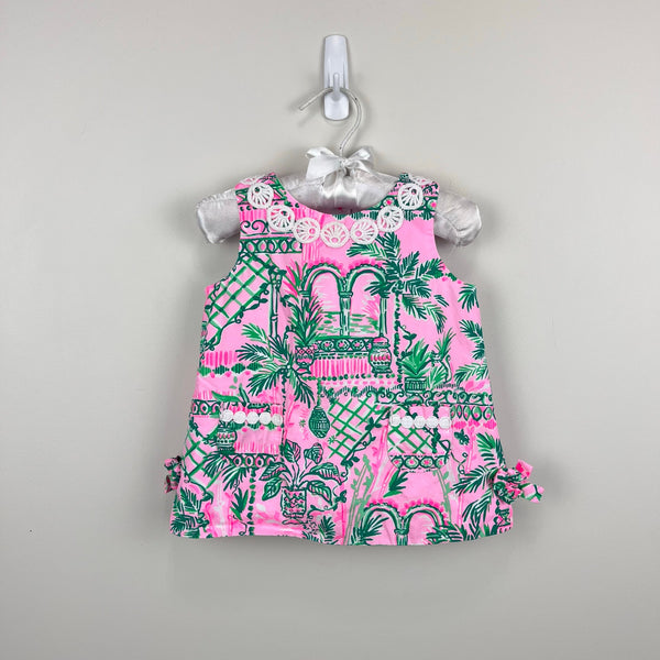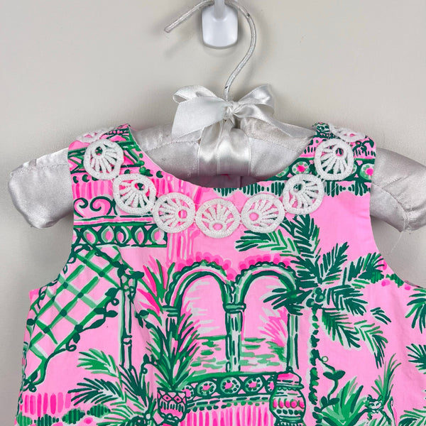 Lilly Pulitzer Baby Lilly Infant Shift Dress Mandevilla Baby Always Worth It. Baby girl size 6-12 months. Classic, preppy style. Sleeveless dress with pink and green palm tree print. Lace detail along the neck and pockets. Fixed bows at the sides. Button back. Fully lined.