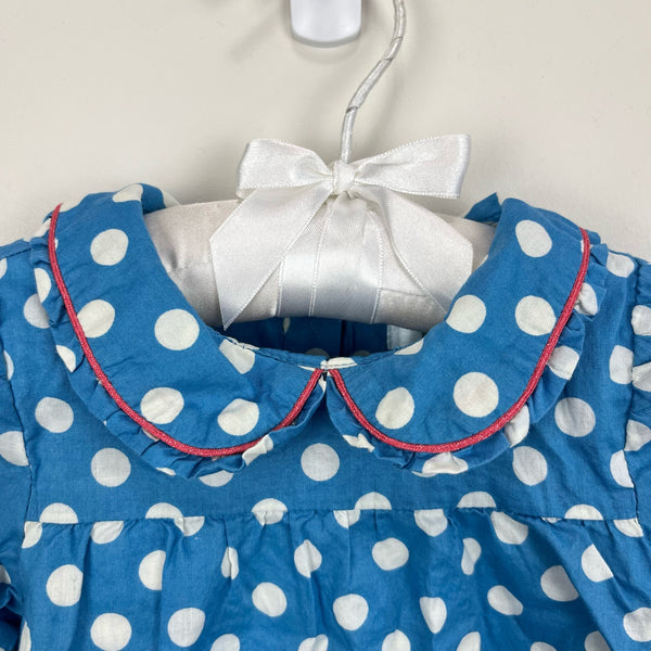 Mini Boden Blue Polka Dot Tunic. Baby girl size 6-12 months. Can function as a dress or shirt; pair with tights or leggings! Longs sleeves. Fully lined. Ruffle collar. Buttons in the back. Great condition with no flaws to note!
