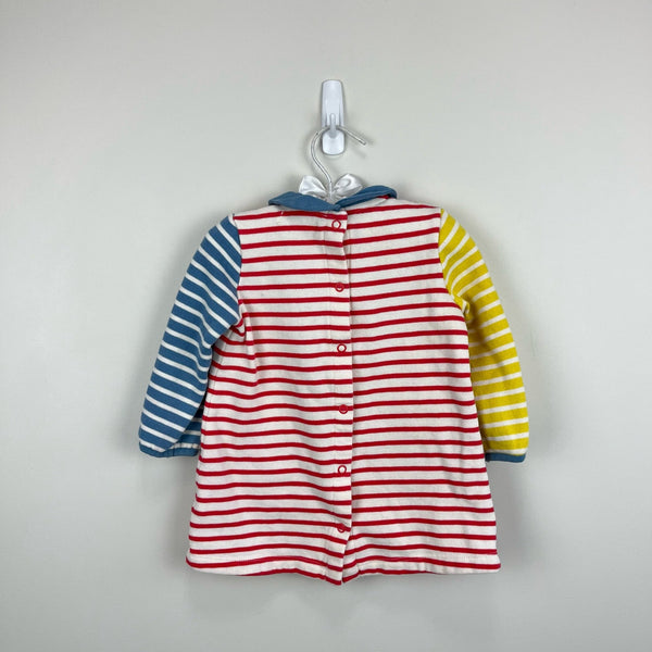 Baby Boden Cozy Striped Pocket Dress. Baby girl size 6-12 months. Long sleeve collared sweatshirt dress. Color block style red, blue, and yellow stripes. Snaps in the back. Great condition with no flaws noted!