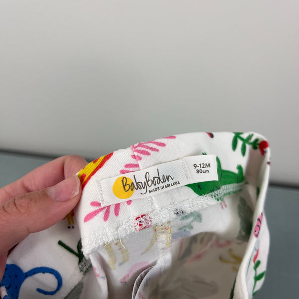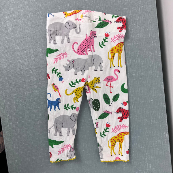 Mini Baby Boden Fun Printed Leggings Ivory Jungle Stamp. Baby girl size 9-12 months. White leggings with colorful zoo animal print - rhinos, elephants, birds, giraddes, flowers, and more! Yellow picot trim at the ankles. Great condition with no flaws noted.