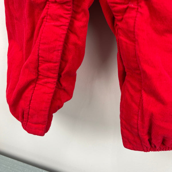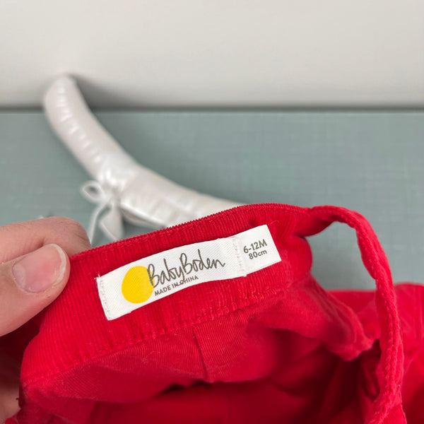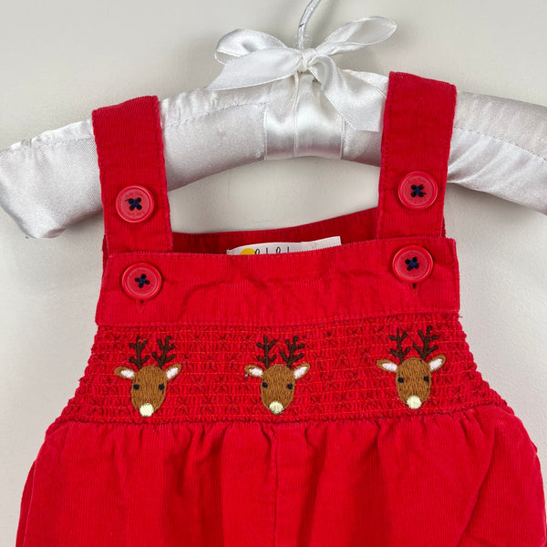 Mini Baby Boden Nostalgic Reindeer Smocked Corduroy Dungarees. Baby boy or girl size 6-12 months. Festive rockabilly red corduroy overalls lined in soft jersey cotton. Smocking across the chest with embroidered reindeer. Snaps along the legs ad adjustable button straps. Excellent condition. Perfect for baby's first Christmas!