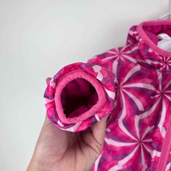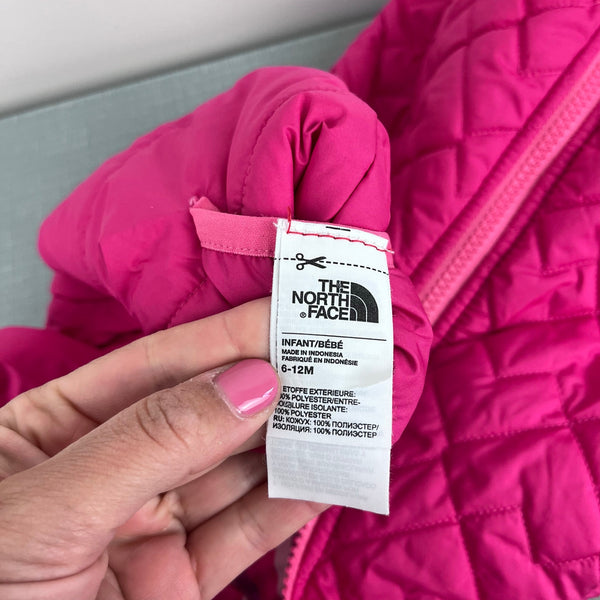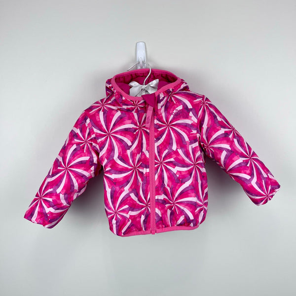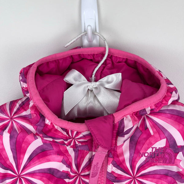 The North Face Infant Reversible Perrito Jacket. Baby girl size 6-12 months. Adorable insulated winter coat. Fully reversible with tag hidden in fold over mitten cuffs. Quilted bright pink on one side, and fun swirl design on the other. Features lightweight but warm insulation, elastic binding on hood, cuffs and hem, chin zip guard, embroidered logos on front and back, and water repellent finish. Excellent condition!
