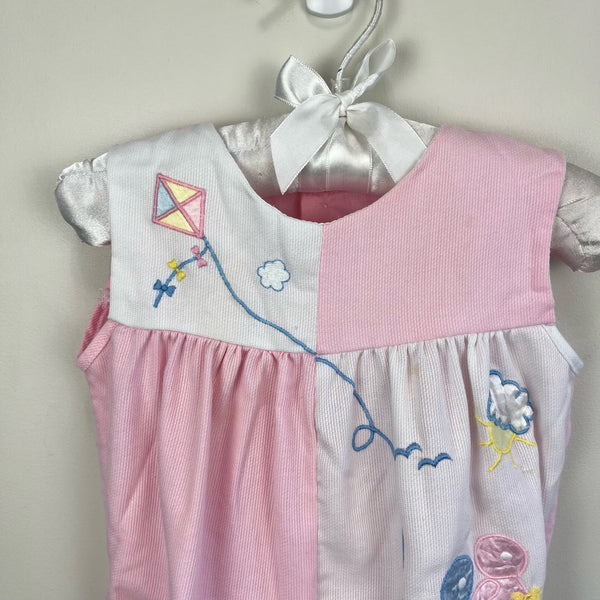 Vintage Pink White Kite Romper. Tag cut out, so please check measurements to ensure fit. (Looks around 6-9 months to me.) Sleeveless one piece 80s/90s outfit. Pink and white color block with embroidered scene of kids flying kites. Elasticized ruffle leg openings. Buttons in the back and snaps at the bottom. Super faint marks (see close up photos). Perfect for summer!
