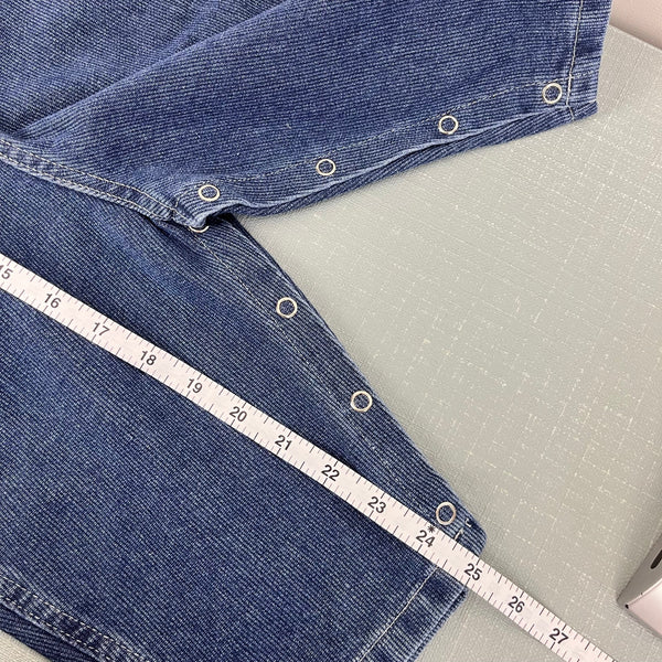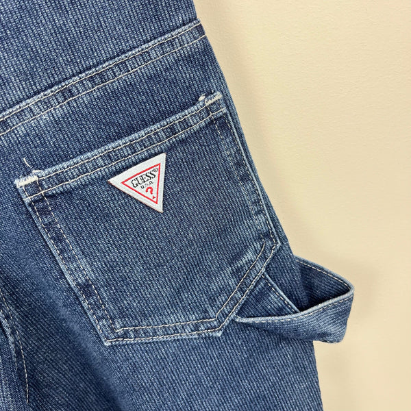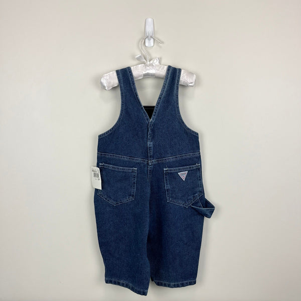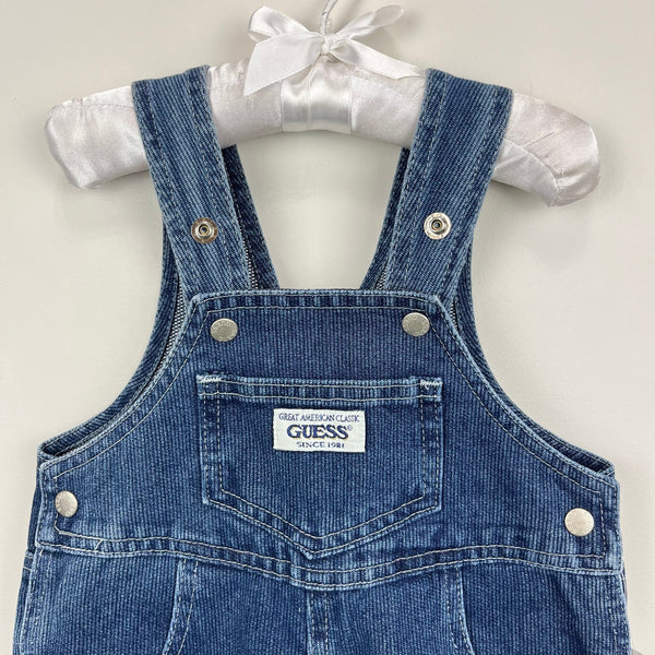 Vintage Baby Guess Blue Jean Overalls. Baby boy or girl size 12 months. Deadstock, brand new with tag (NWT). USA made. 100% cotton; these feel more like a soft knit vs traditional stiff denim - perfect for a baby on the move! Adjustable snap straps and snaps along the legs. Carpenter style. Bib pocket. Signature triangle logo in the back.