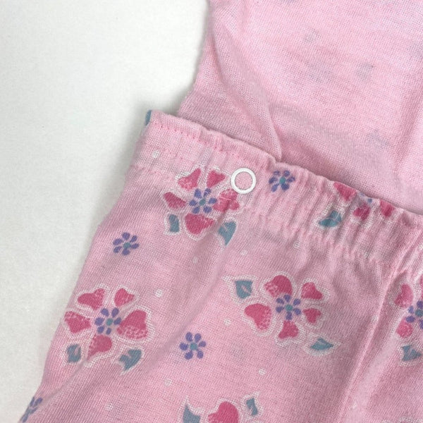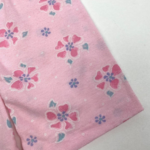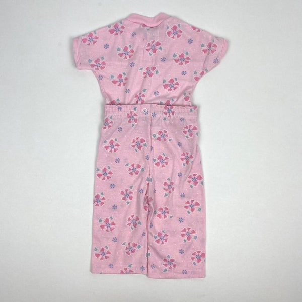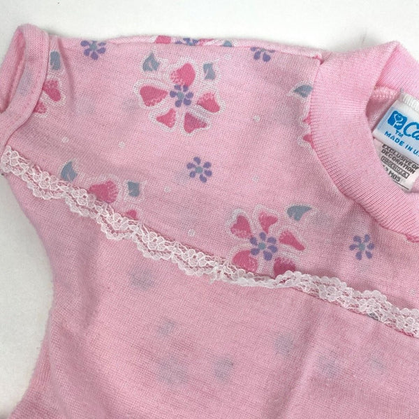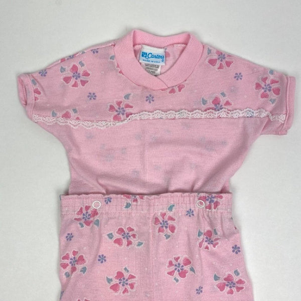 Vintage Carter's Pink Two Piece Pajama Set. Baby girl size 12 months. Made in the USA. Two piece footed PJ set circa the 90s. Pink with hearts and flowers, and white lace across the chest. I believe the waistband is relaxed, but that's what the snaps are for! Typical wear to the fabric. See photos for measurements.