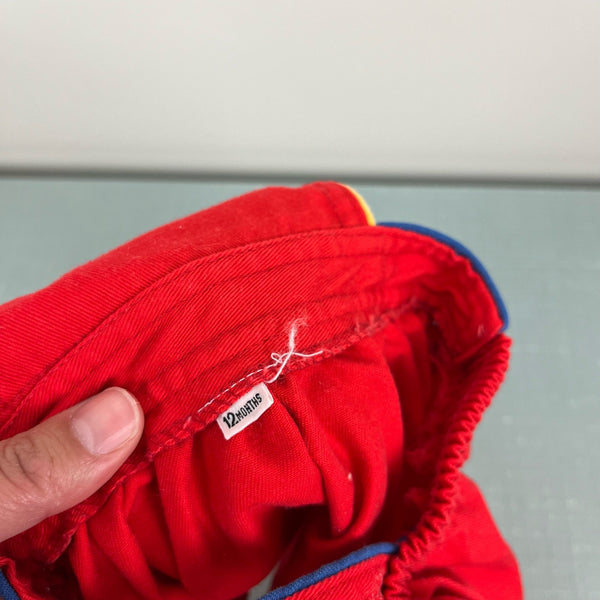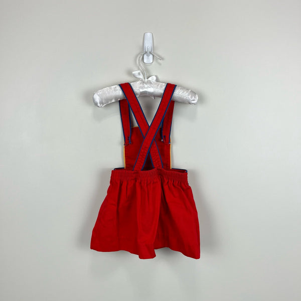 Vintage Girls Red Jumper. Baby girl size 12 months; see last photo for STH measurement. Overalls style dress with fun navy blue and yellow piping. Button straps and elastic waist. Great condition with no flaws to note!