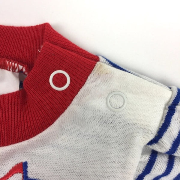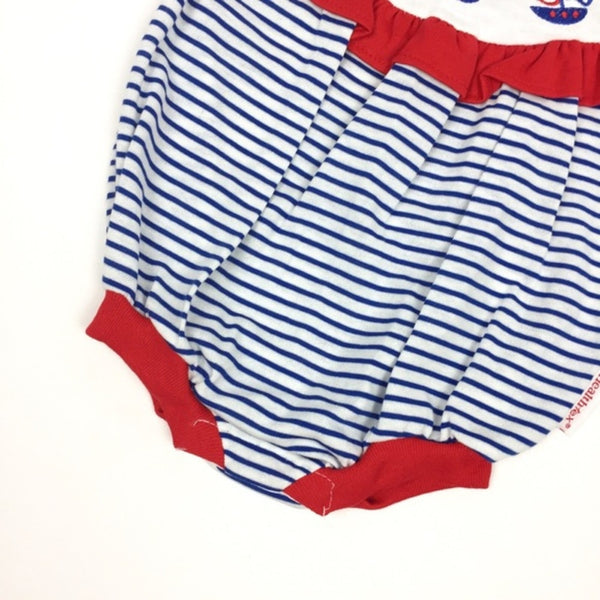 Vintage Healthtex Nautical Sailboat Romper. Baby girl size 12 months. USA made. Dead stock, brand new with tag (NWT). Red, white, and blue... perfect for Memorial Day, 4th of July, and all summer long! Cute but simple bubble shape with ruffle and sailboats across the top. Light mark on shoulder (pictured), but looks like it'll come right out in first wash.