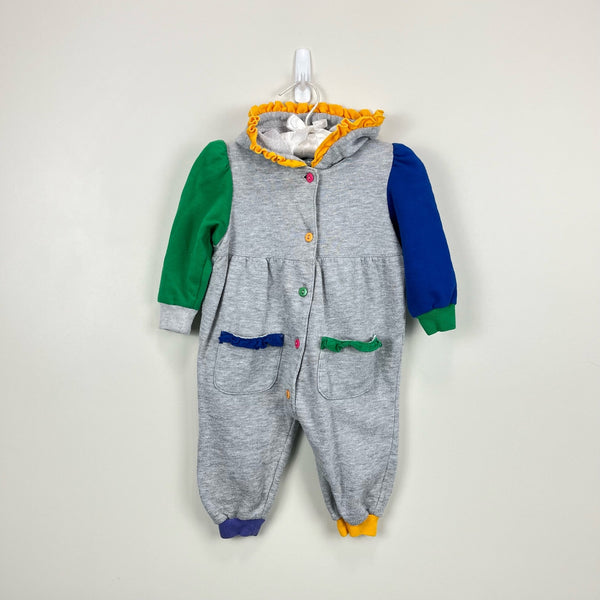 Vintage Jetset Gray Rainbow Hooded Coverall. Tag faded, but maybe baby girl size 12 months? See last photo for measurements. Cute and cozy one piece outfit. Gray with yellow, blue, and green cuffs and ruffles. Colorful buttons down the front, too! Light wear to fabric; no stains, tears, etc.