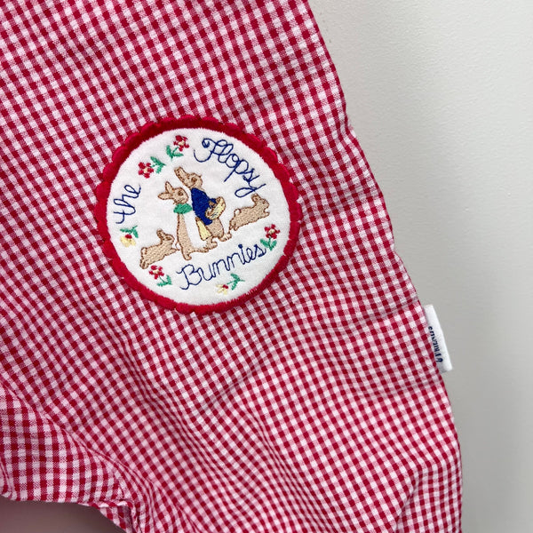 Vintage Beatrix Potter Peter Rabbit & Friends Plaid Ruffle Romper Coverall. Baby girl size 12 months. USA made. The cutest one piece jumpsuit outfit! Red and white picnic plaid with floral, ruffle lined round bib collar. Snaps in the back and along the legs. A patch with "the flopsy bunnies" on the leg. Elastics in cuffs are worn out, but no other flaws noted!