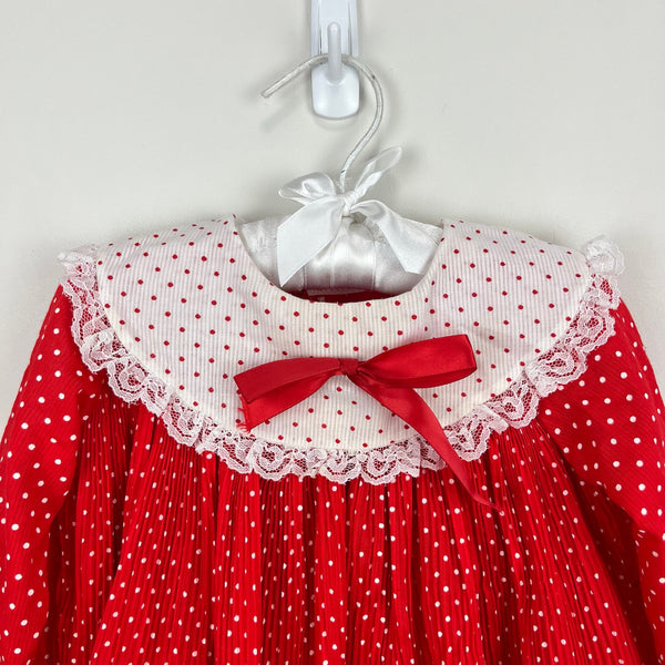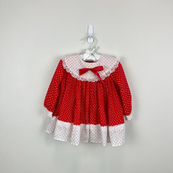Vintage Red Ruffle Polka Dot Dress. Baby girl size medium (looks around 12 months to me). USA made. Long sleeve pleated dress with round white bib collar lined in lace and finished with a ribbon bow. Buttons in the back. Circle skirt is perfect for twirling or pairing with a slip for extra fullness!