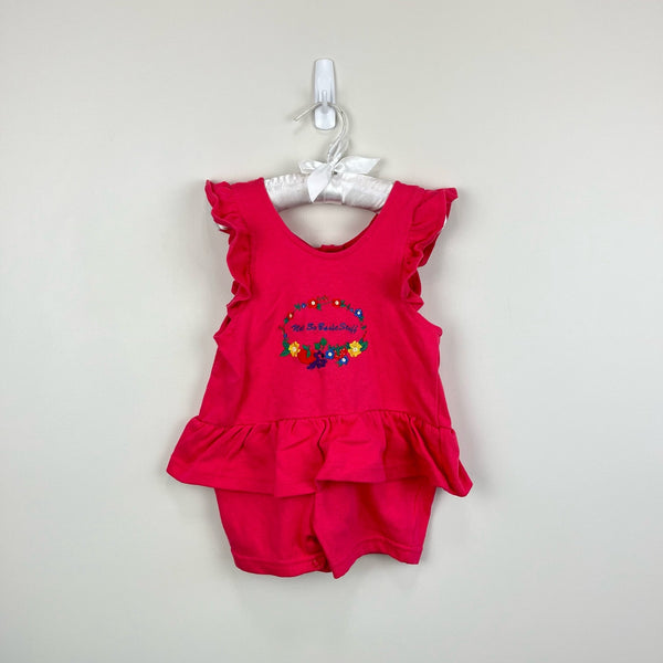 Vintage The Place Peplum Ruffle Romper. Baby girl size XS (6-12 months). Brand new without tag (NWOT). Bright pink sleeveless one piece outfit. Shorts bottom with ruffle around the waist. Embroidered fruits and flowers and "Not So Basic Stuff" on the chest. Snaps in the back and along the legs for easy on/off.