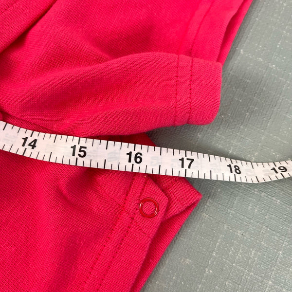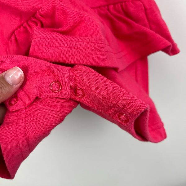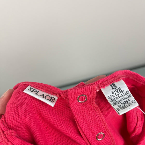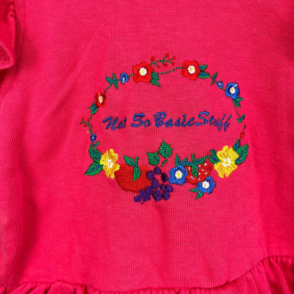 Vintage The Place Peplum Ruffle Romper. Baby girl size XS (6-12 months). Brand new without tag (NWOT). Bright pink sleeveless one piece outfit. Shorts bottom with ruffle around the waist. Embroidered fruits and flowers and "Not So Basic Stuff" on the chest. Snaps in the back and along the legs for easy on/off.