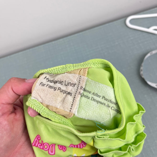 Vintage Y2K Finding Nemo Ruffle Swimsuit. Baby girl size 12 months. Deadstock, brand new with tag (NWT), though does have light marks on the back (see last photo; untreated). Lime green one piece bathing suit with fixed blue bows at the straps and ruffles across the bum. Features Disney's Nemo and Dory with tropical flowers. Twin match available separately!