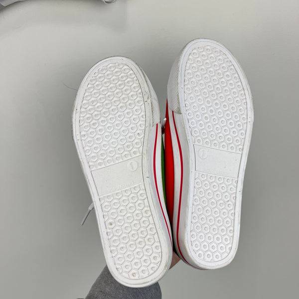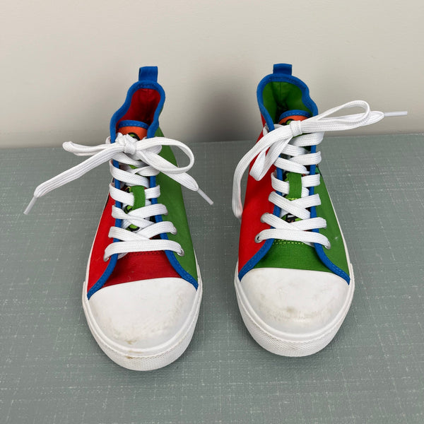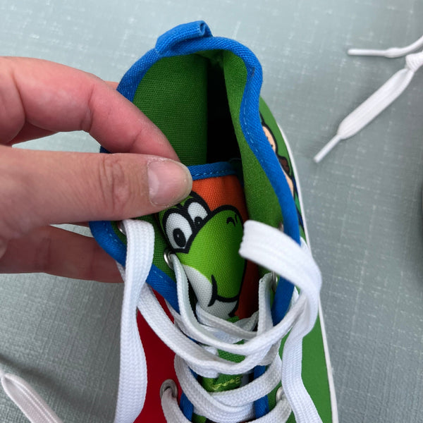 Nintendo Super Mario Brotherss High Top Luigi and Mario Sneakers. Boy or girl shoe size 1. Fun color block style with red Mario on one side and green Luigi on the other. Great condition with light wear/marks.