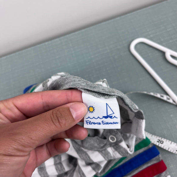 Florence Eiseman Stripe Knit Robot Longall Romper. Baby boy size 9 months. Cozy long sleeve one piece coverall outfit. Gray and white stripes with applique robot on the chest and colorful stripes on the sleeves. Snaps on the shoulder and inseam zipper for easy on/off. Great condition with no flaws noted!