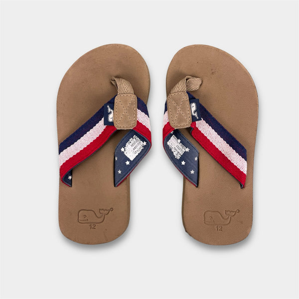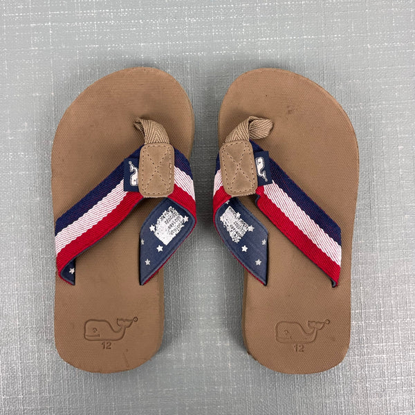Vineyard Vines Boys' Americana Ribbon Strap Flip Flops. Toddler boy shoe size 12. Classic, preppy flip flops with red and white striped straps. Light wear from use. Perfect for 4th of July and all summer long!