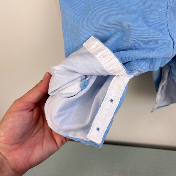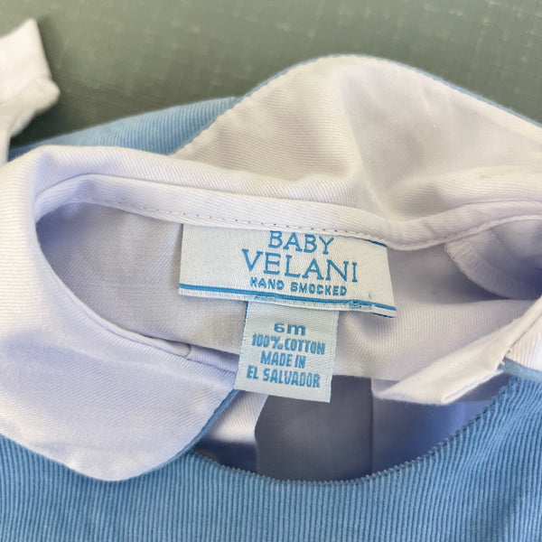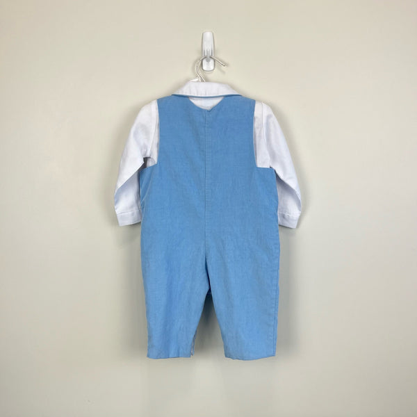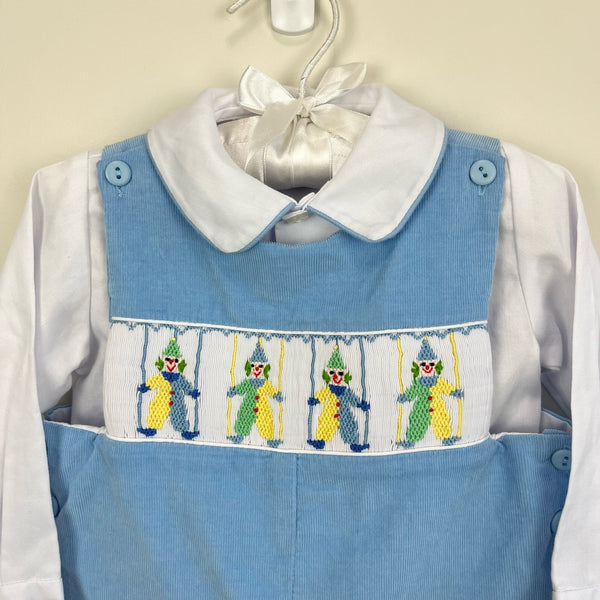 Baby Anavini Velani Smocked Clown Longall Set. Baby boy size 6 months. Two piece outfit includes long sleeve white dress shirt and light blue lined corduroy overalls. Romper features buttons on the shoulders, snaps along the legs, and hand smocking across the chest with embroidered clowns. Excellent condition.