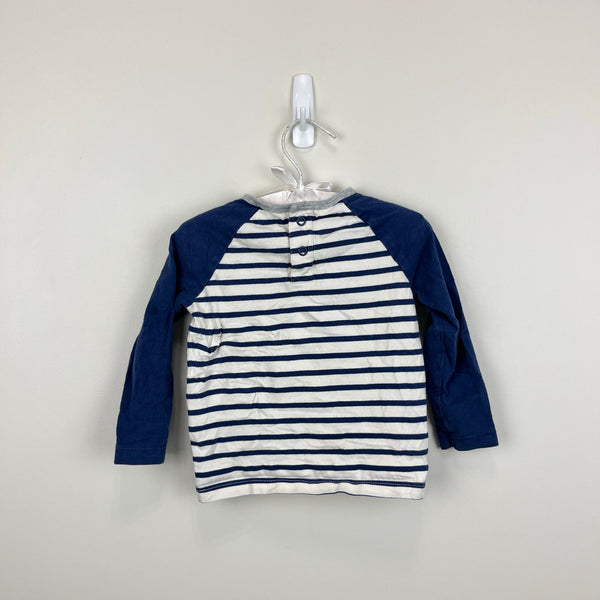 Mini Boden Navy Striped Royal Sprout Long Sleeve Applique Tee Shirt. Baby boy or girl size 6-12 months. Play condition for tears on front and back; maybe could be fixed with a patch/sewn, but really a great project piece; take the applique and put it on something else! (Or if you have a kiddo who is going to destroy their clothes regardless, layer with a bodysuit and wear as-is!) Raglan style with navy blue and white stripes and solid sleeves. Snaps in the back. Fun design with Sprout the dog dressed as a king on the front!