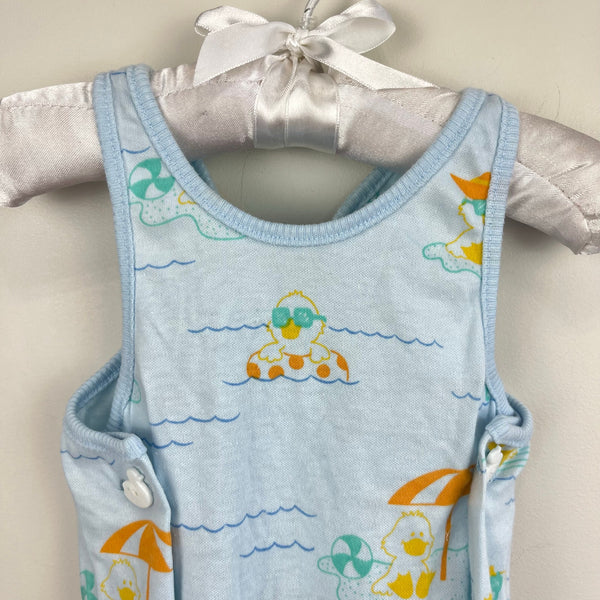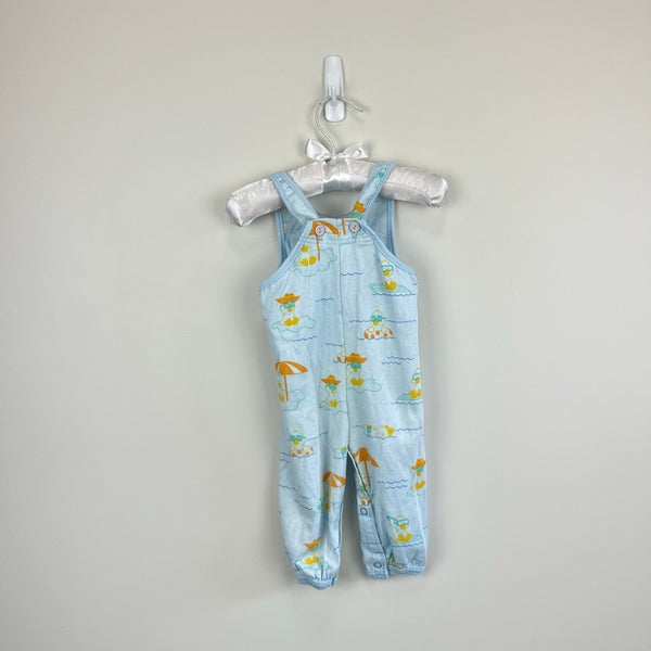 Vintage Carter's Blue Beach Overalls. Baby boy size 9 months. USA made. Cozy one piece romper outfit with the cutest print - a duck enjoying his day at the beach with a ball, umbrella, and even a float! Love the unique cut of this with the buttons on the sides! Snaps along the legs and button straps for easy on/off. Great condition with no flaws noted!