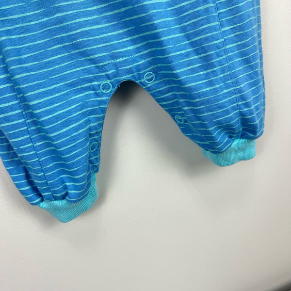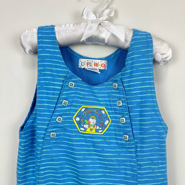 Vintage Offspring Flyer Overalls. Baby boy size 6 months. Soft, sleeveless one piece outfit in blue and green stripes. Adorable design with buttons at the chest and a baby pilot patch!