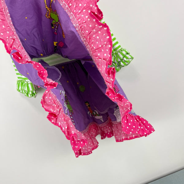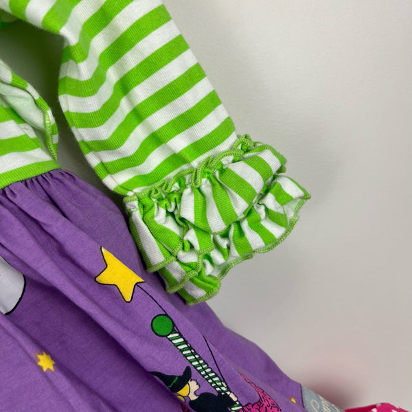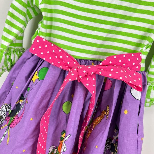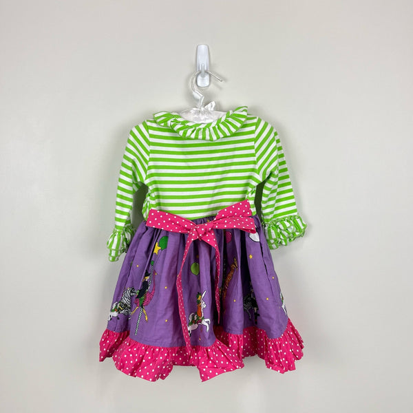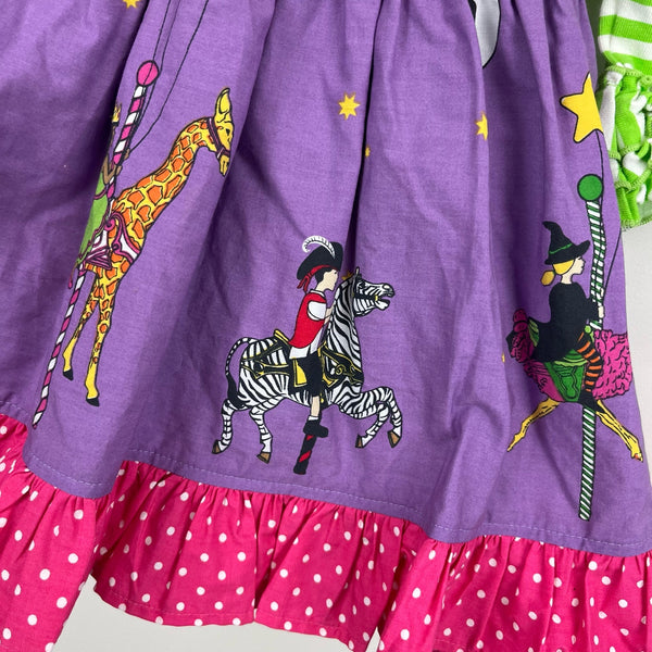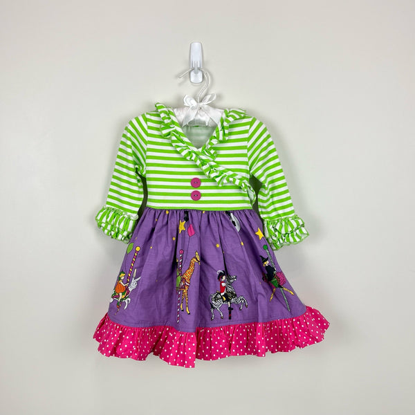 Eleanor Rose Halloween Costume Carousel Miley Dress. Baby toddler girl size 18 months. Long sleeve ruffle dress. Green and white striped top, purple full-skirt bottom, and pink polka dot bow in the back. Fun print with kids riding the merry go round in their costumes!