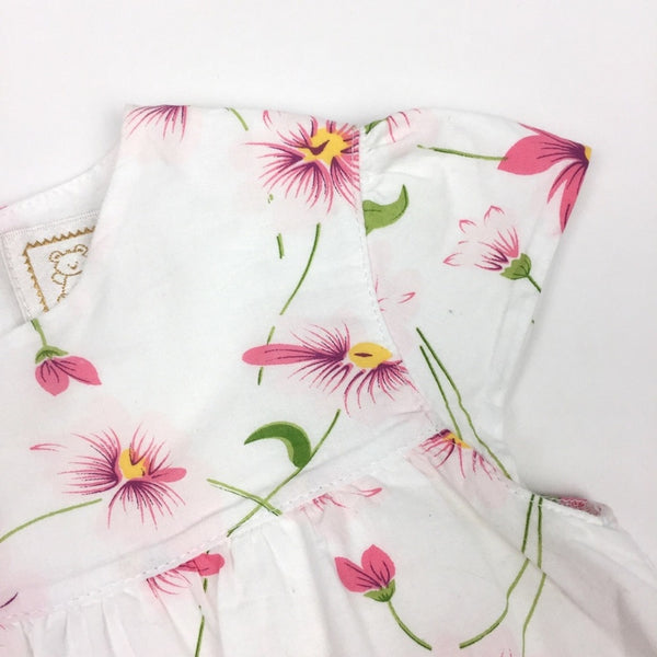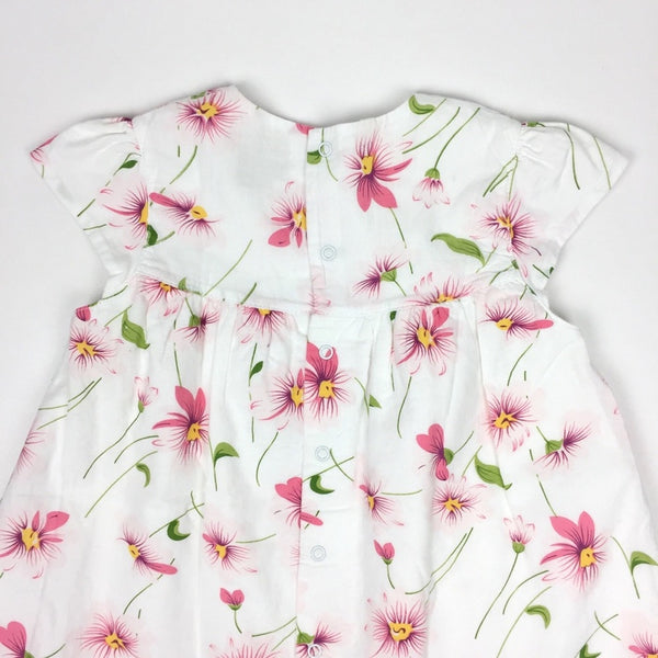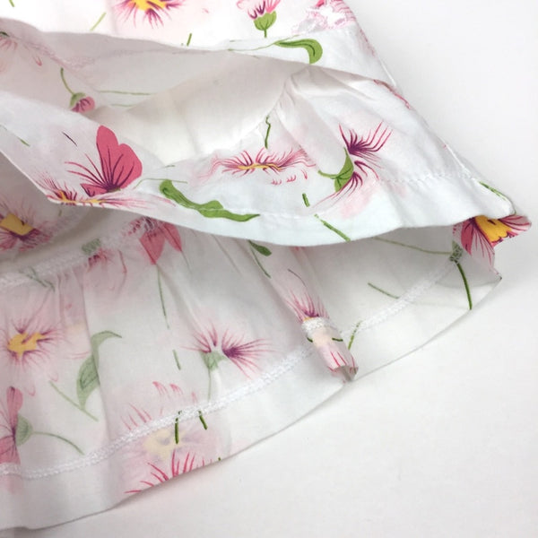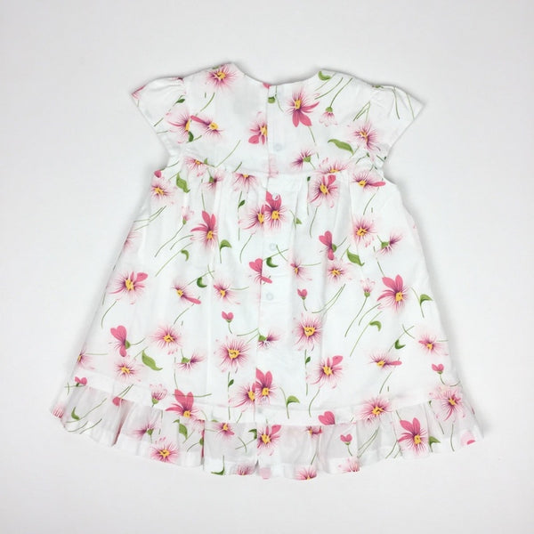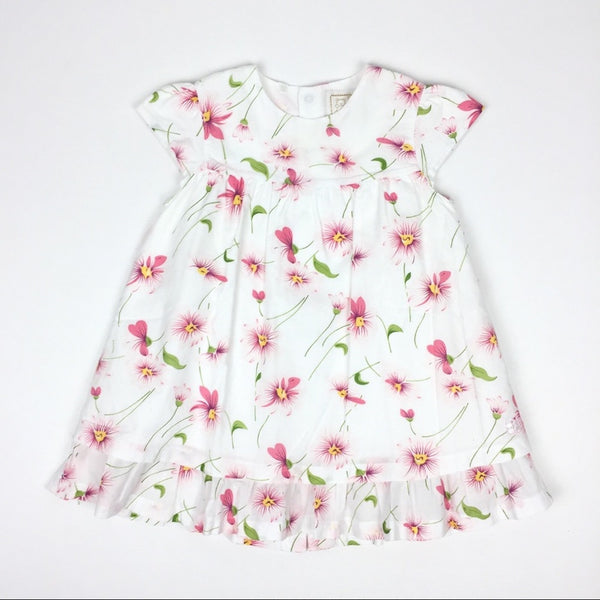 Emile et Rose White Pink Floral Dress. Baby girl size 12 months (76 cm). From British brand known for timeless, traditional clothing and accessories for babies. Crisp white with pink and green flower print - has a bit of a water color look to it. Short sleeves and layered skirt. Round collar and buttons in the back. Perfect for spring and summer. Excellent condition!
