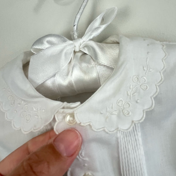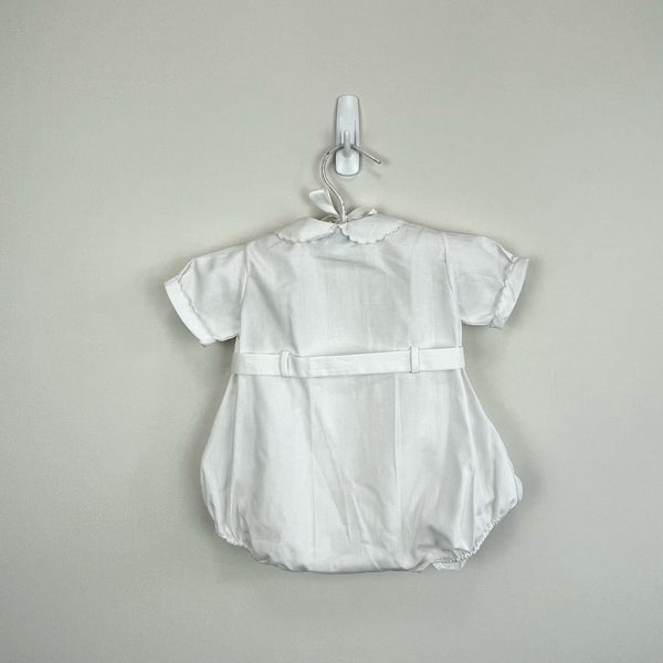 Vintage Feltman Brothers White Hand Embroidered Scallop Collar Button Belt Creeper. Brand new without tag (NWOT), though the elastic in the legs is stiff from age and there is the faintest discoloration at the top button (see photo). No size tag, but measures like baby girl or boy newborn; see size chart. Beautiful and timeless details on this one piece bubble romper. Scallop collar with embroidery Peter pan collar, scallop detail at the cuffs, pleats down the center, and button belt around the waist. Snaps at the bottom and button down the front for easy dressing. Perfect for a christening, wedding, or other special occasion!