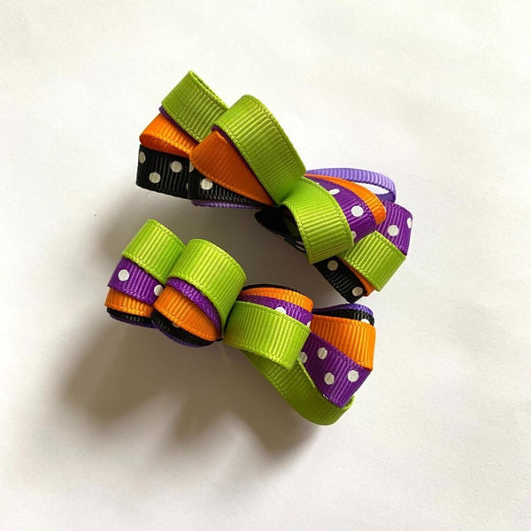 Little Girls Halloween Ribbon Hair Bows. Festive green, purple, orange, and black ribbon clips. Excellent condition!