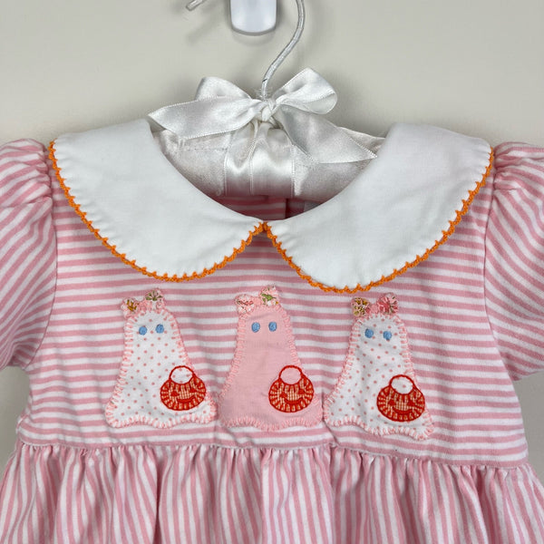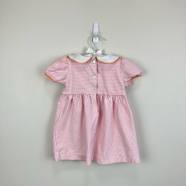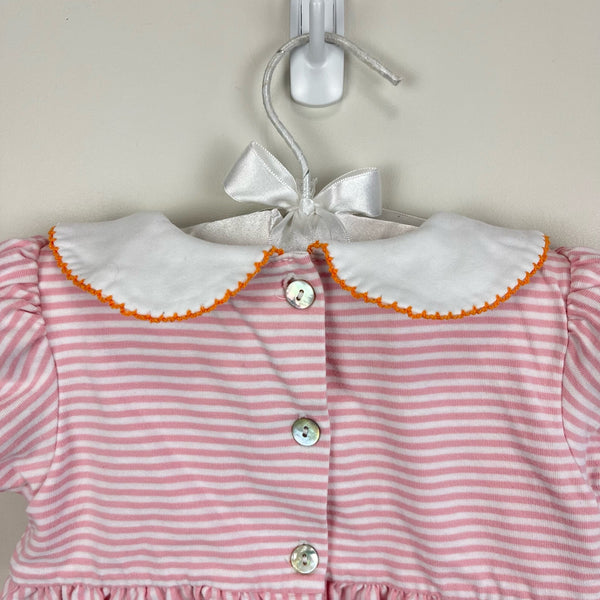 Shrimp & Grits Kids Pink Stripe Halloween Dress. Baby toddler girl size 18 months. It doesn't get any cuter than this! Shirt sleeve pink and white striped dress with peter pan collar and patch pockets. Applique trick or treat ghosts on the chest. Buttons in the back. Tiny spot on the pocket (see last photo).