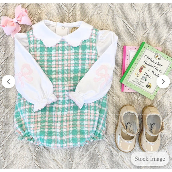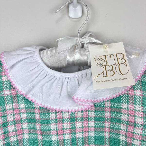 The Beaufort Bonnet Company Brooksy Bubble Set Putney Plaid with Worth Avenue White & Palm Beach Pink Picot. Toddler girl size 2T. Brand new with tag, in bag (NWT) and would make a great gift! Match for little sister (6-12 months) available separately. (Also have a size 8 skirt that can be listed upon request.) Adorable dressy two piece romper outfit set Super soft pink, green, and white plaid bubble and matching ruffle collar white short sleeve top. Elasticized leg openings, snaps at the bottom, and buttons at the shoulders.