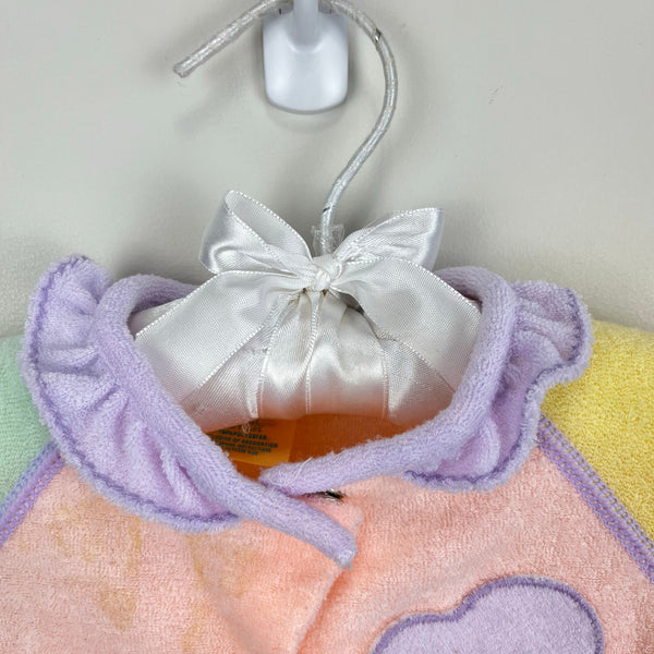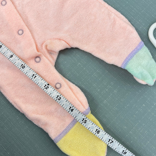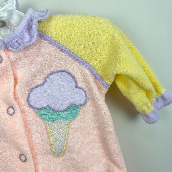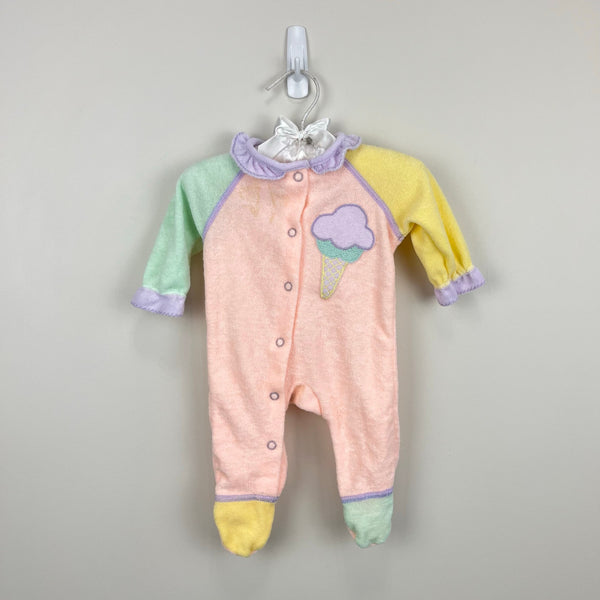 Vintage Carter's Pastel Ruffle Ice Cream Footie. Baby girl size small (up to 11 lbs so the equivalent of newborn). Cozy terry one piece outfit in color block pink, purple, green, and yellow. Fun ruffle collar and ice cream cone on the chest. Snaps down the front for easy on/off. Has marks (see last photo; untreated).