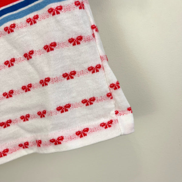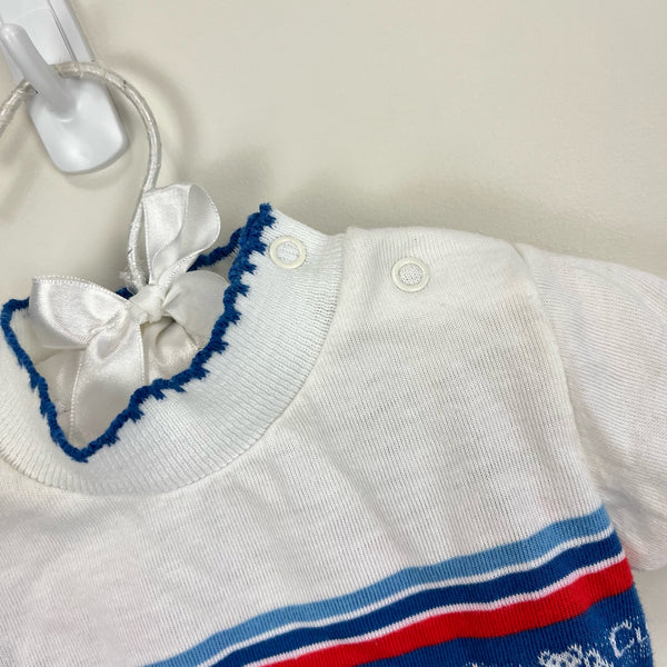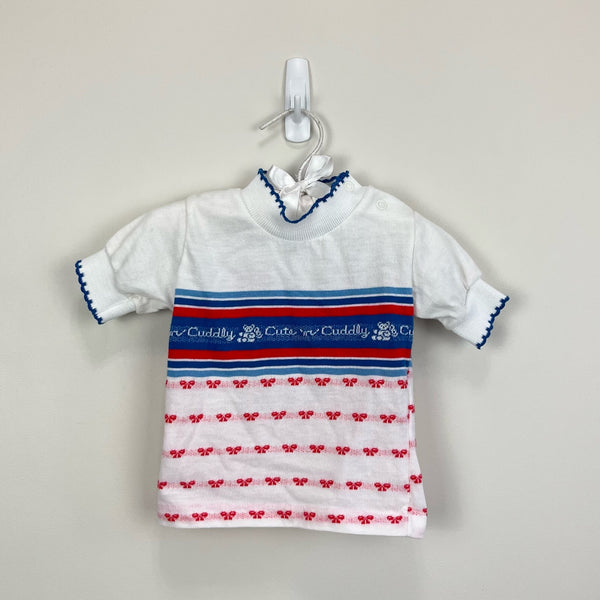 Vintage Hammer Knitwear Cute 'n Cuddly Shirt. Baby girl size 12 months. Short sleeve white top with embroidered red ribbon bows, blue stripes, and teddy bears. Scallop trim collar and snaps at the shoulder.