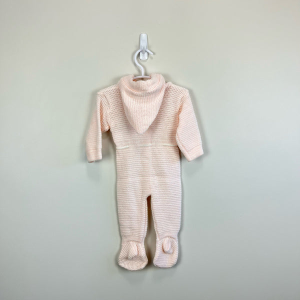 Vintage Novelty Knit Light Pink Coverall. I don't see a size, but probably best for 3-6 months. Seems unworn, brand new without tags. Timeless one piece hooded sweater outfit. Features covered feet, buttons, ties at the waist and hood, and embroidered dog on the chest!