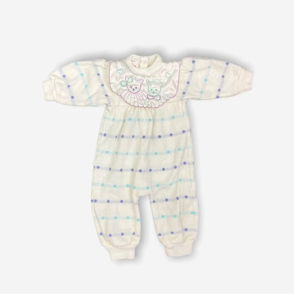 Vintage Winnie the Pooh Sweater Jumpsuit. Baby girl size 12 months. Ivory white one piece romper outfit with pastel purple and green stripes. Fun bib collar with embroidered cats. Missing one button but looks to function fine without.
