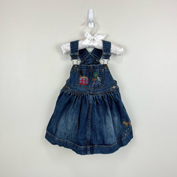 Ralph Lauren Embroidered Blue Jean School Jumper Dress. Baby toddler girl size 18 months. Skirtall style overalls with adjustable straps. Embroidery on the bib pocket with a red school house and ABC. Has a dog on the skirt, too! Excellent condition.