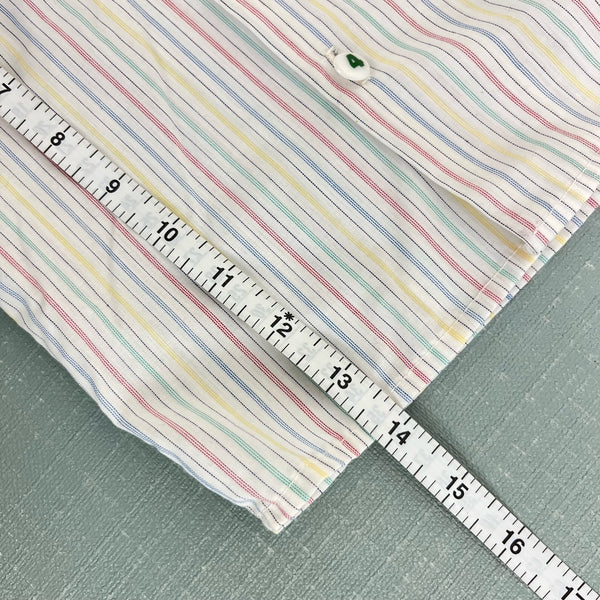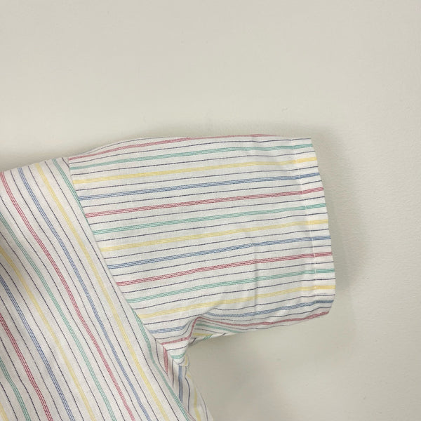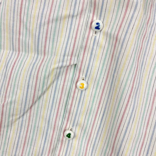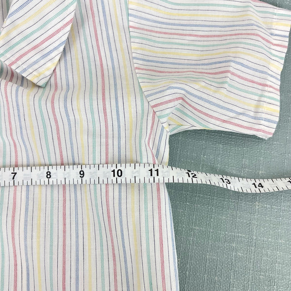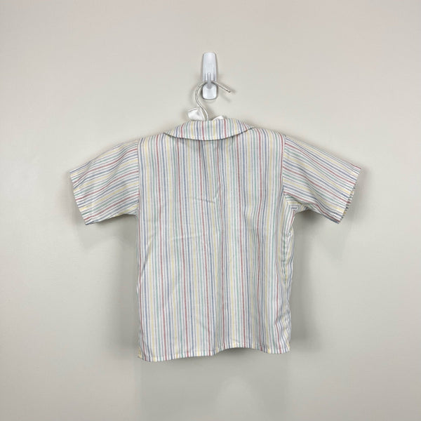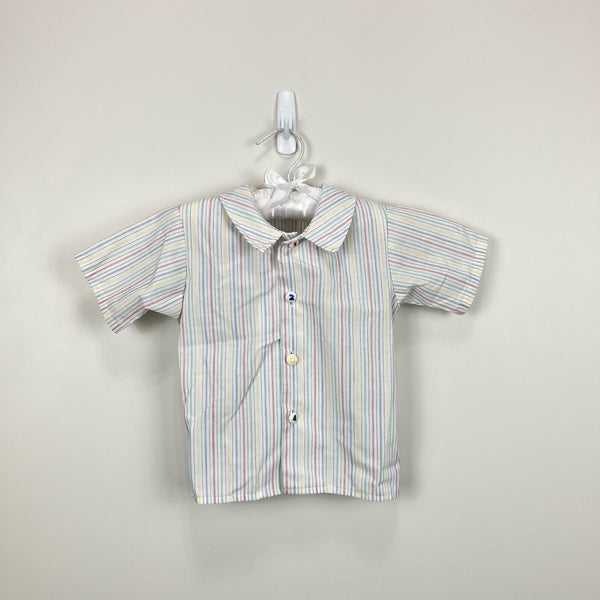 Vintage Jack Jar Rainbow Stripe 123 Shirt. No size; please check measurements to ensure fit. (Looks about a toddler boy or girl size 3T to me.) Short sleeve collared button up shirt. Colorful stripe and numbered buttons. Perfect for back to school!