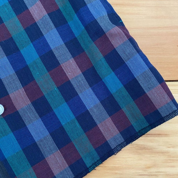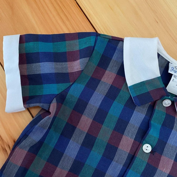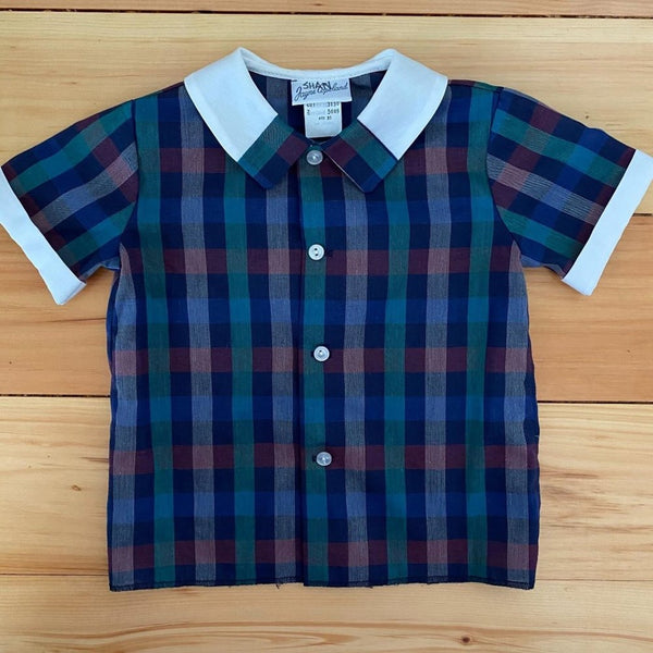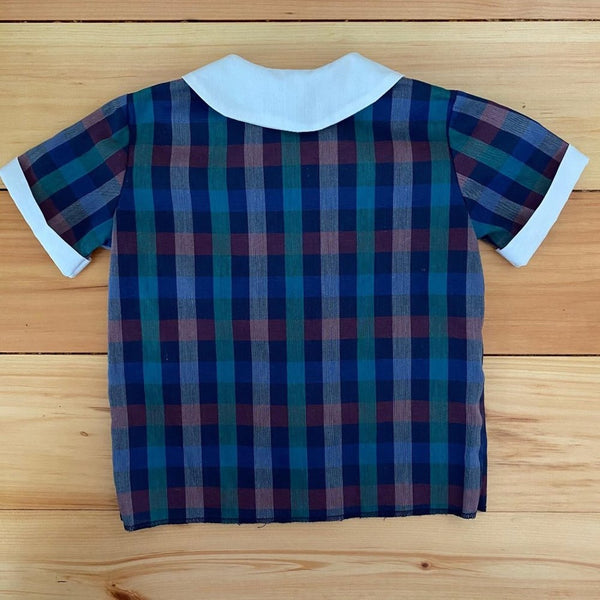 Vintage Jayne Copeland Plaid Blouse. Toddler girl size 3T. Short sleeve button up shirt. Pretty shades of blue, green, purple and red with contrasting white collar and sleeve cuffs. Perfect for fall! Pair with a skirt, overalls, or even jeans!