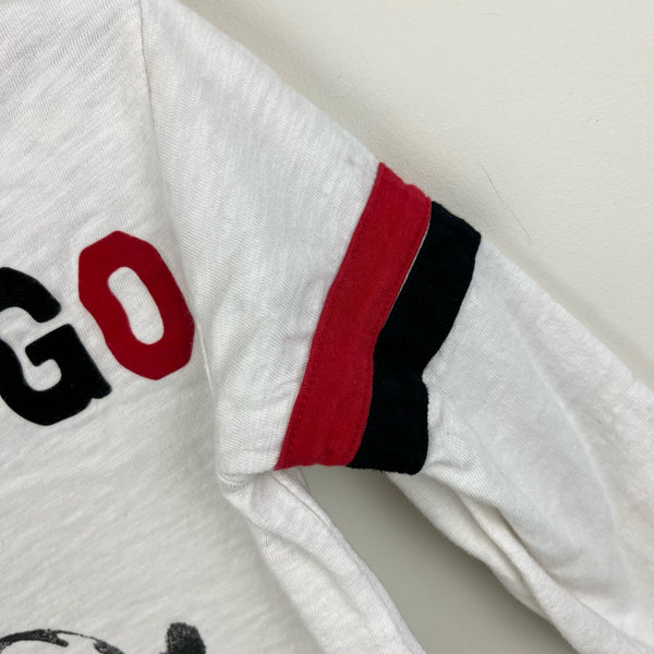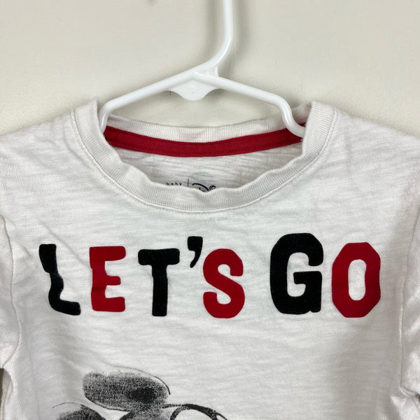 Gap Disney Mickey Mouse Long Sleeve T-Shirt. Toddler boy size 4T. Casual white top with red and black Mickey Mouse design. Stripes on the sleeves and "LET'S GO" on the front. Has some light marks (see photos; untreated).