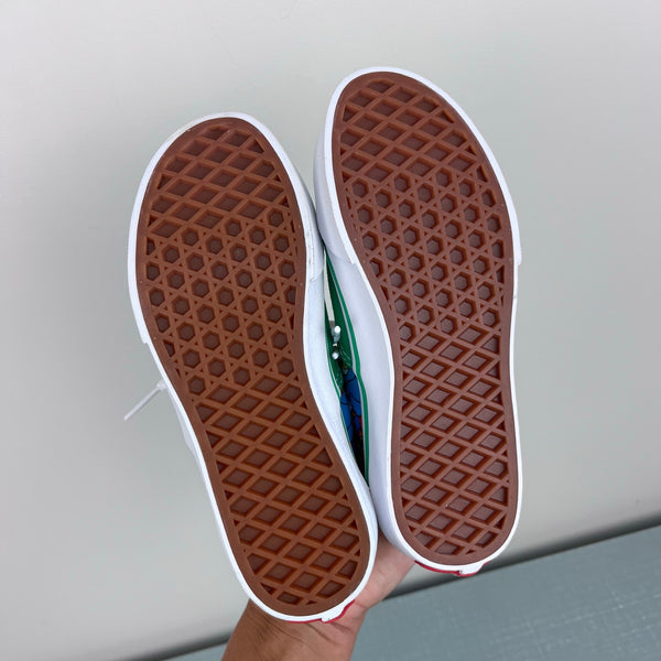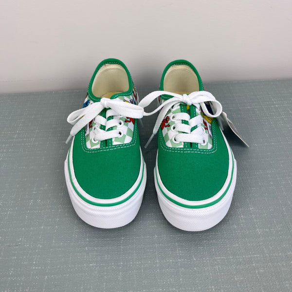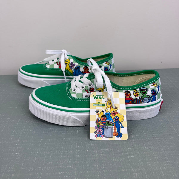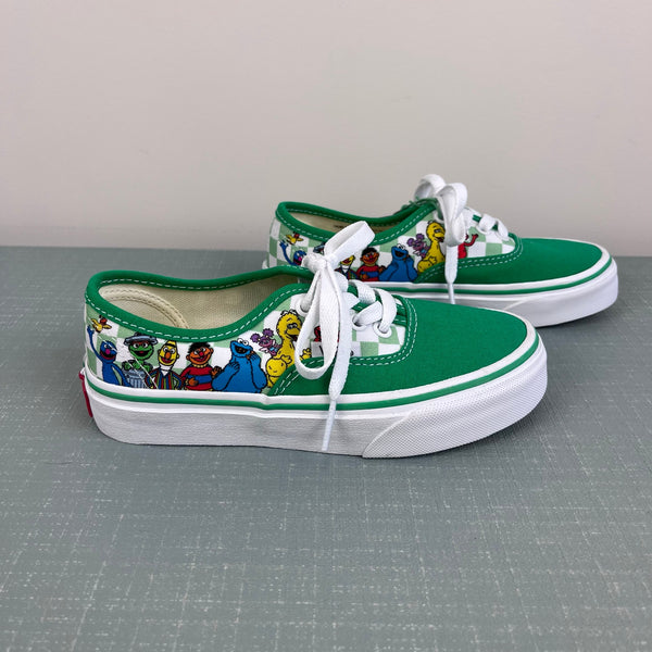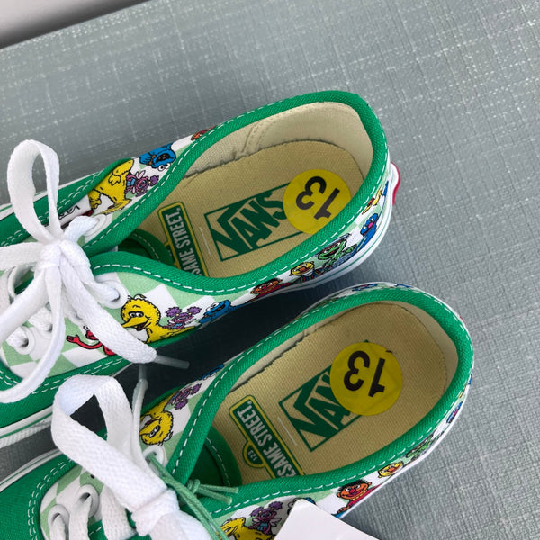 Vans X Sesame Street Little Kids Old Skool Shoe Green Multi. Toddler boy or girl shoe size 13. Brand new with tag (NWT), without box. Classic skater sneakers with white bottoms and green canvas upper featuring characters from Sesame Street - Oscar, Grover, Big Bird, Cookie Monster, Bert, Ernie, Abby, and Elmo, too! Sibling match available separately (size 12).