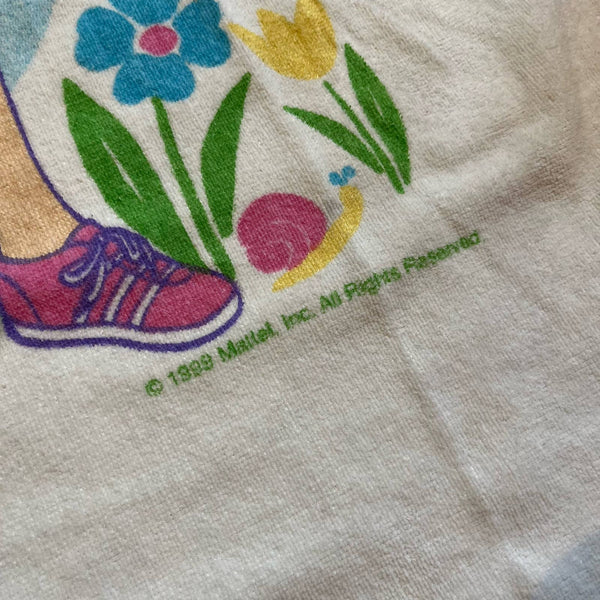 Vintage 90s Barbie Beach Towel. 1999 Mattel. Features Barbie in flower garden. White isn't super bright, but no specific flaws to point out.