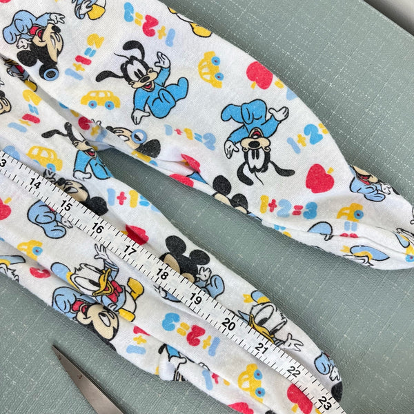Vintage Baby Mickey Footie Sleeper. Tag cut out (small hole left at seam; see last photo), so please check measurements to ensure fit. (I'd guess around 9 months). Cute and cozy one piece collared coverall outfit. White with Disney's Mickey Mouse, Goofy, Donald Duck, hearts, cars, and 1+2=3.