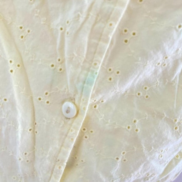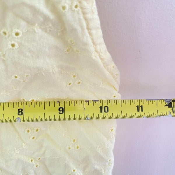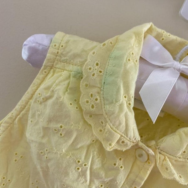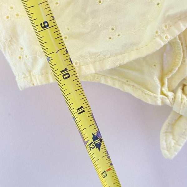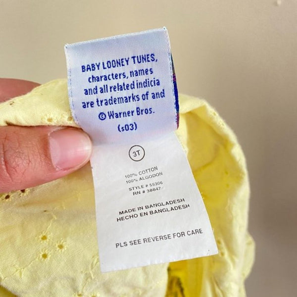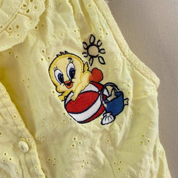 Vintage Looney Tunes Yellow Eyelet Top. Toddler girl size 3T. Love this y2k style! Sleeveless collared button up cropped shirt with tie at the waist. Features Tweety Bird at the beach. So cute with jean shorts for summer! Has a few untreated light green spots (pictured; I think less noticeable in person,).