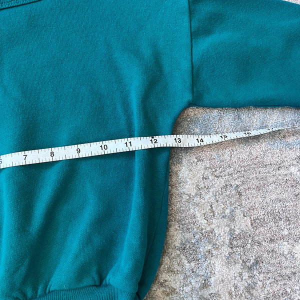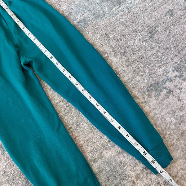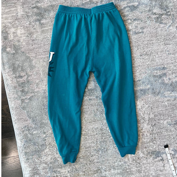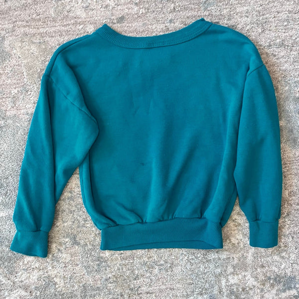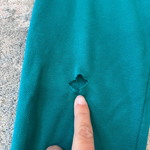 Vintage Pacific Coast Athletic 1995 Looney Tunes Warner Bros Taz Basketball Sweatsuit. Boys size 6 years. Two piece outfit includes pullover crewneck sweatshirt and matching sweatpants. Green with "You playin' or what?" and the Tasmanian Devil in a purple basketball uniform. This was an absolute favorite here: there is a hole in one knee, a repair at the crotch, and a light mark on the back of the sweatshirt. (Repair was there when we purchased and it held up for my kiddo's many wears.)