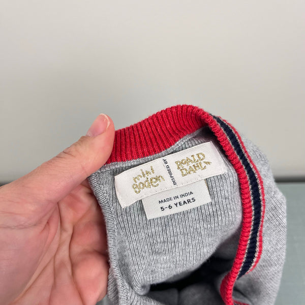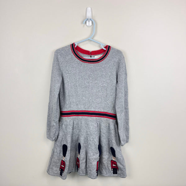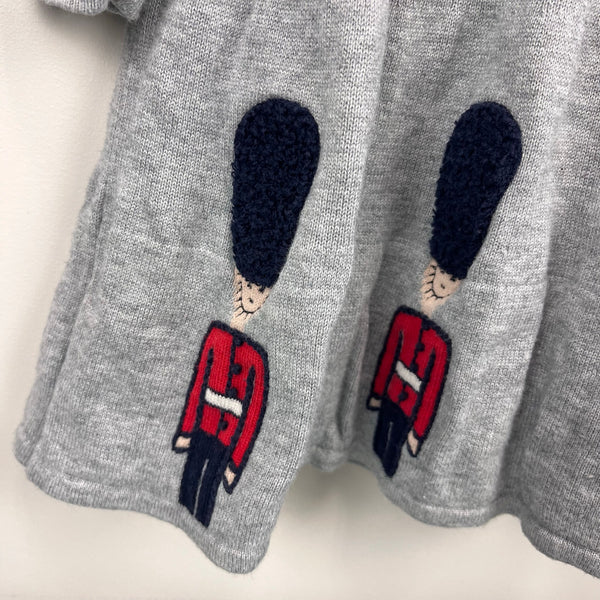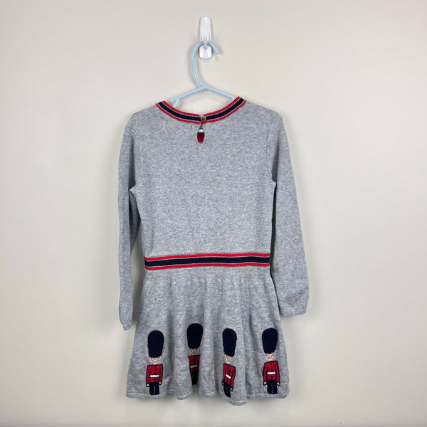 Mini Boden x Roald Dahl The BFG Knitted Royal Guards Dress. Girls size 5-6. Long sleeve gray dress with boucle applique British soldiers along the hem. Red and black stripes the neckline and button in the back. Inspired by the book The Big Friendly Giant. Super soft and cozy cotton blend. Excellent condition with no flaws noted!
