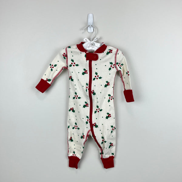 Hanna Andersson Festive Holly Pajamas. Baby boy or girl size 60 cm (US 3-6 months). Cozy fitted one piece PJs. Full zip with snap flap at the chin. Creamy ivory with red and green holly print. Perfect for Christmas!