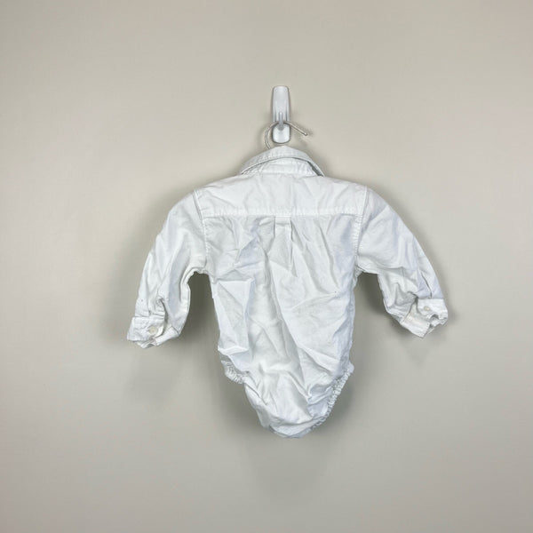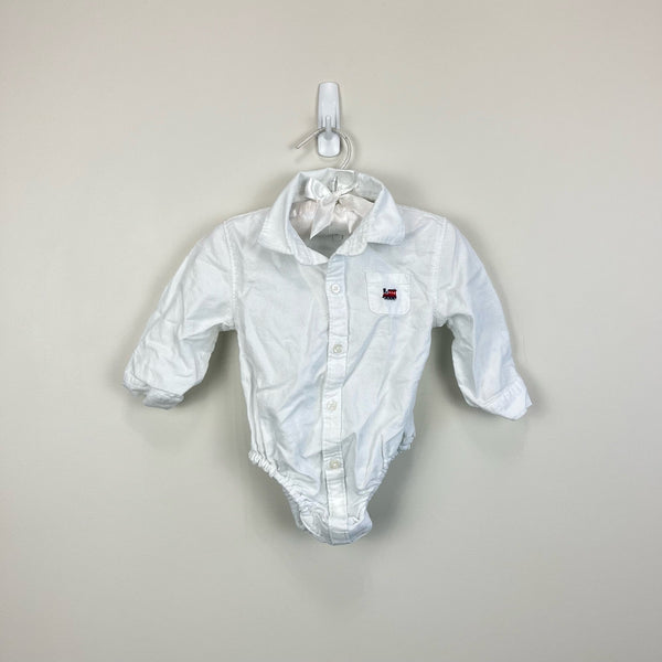 Janie and Jack Baby Train Oxford Bodysuit. Baby boy size 6-12 months. Classic white collared dress shirt with the convenience of a bodysuit. Festive train embroidered on the chest pocket. Excellent condition, just wrinkled from being put away since Christmas!