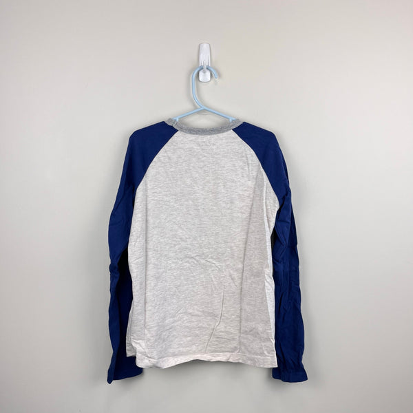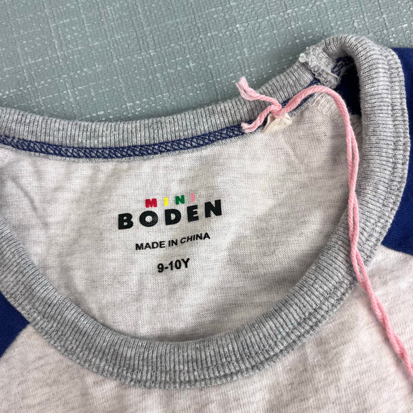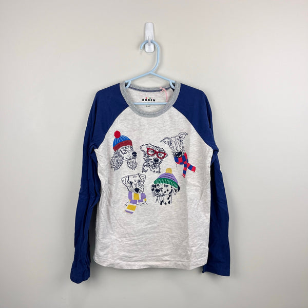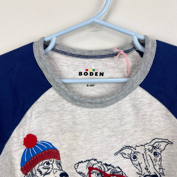 Mini Boden Stitch Logo T-Shirt Oatmeal Marl Dogs. Boy or girl size 9-10 years. Super soft long sleeve raglan top. Gray with navy blue and fun embroidered dogs wearing scarves and hats! I'm 99% sure this is never worn, new without tags (NWOT) - I think my son took the tag off and then changed his mind and put on another shirt!